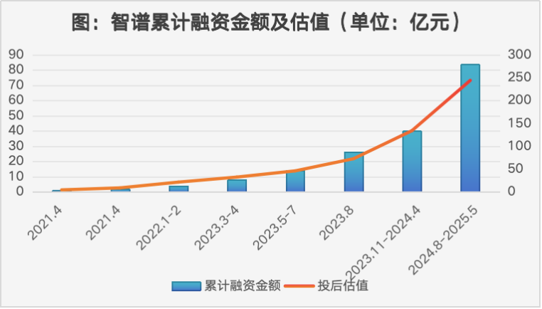 2022年12月Chat GPT发布后,智谱也相继跟进了智谱清言、基座大模型GLM-4等产品,并同步迎来融资爆发期。机构的蜂拥而至,令智谱的估值从B1轮的21.1亿元飙升至IPO前的243.8亿元,其累计斩获的83.6亿元融资中,超九成集中在2023—2025年这三年间。