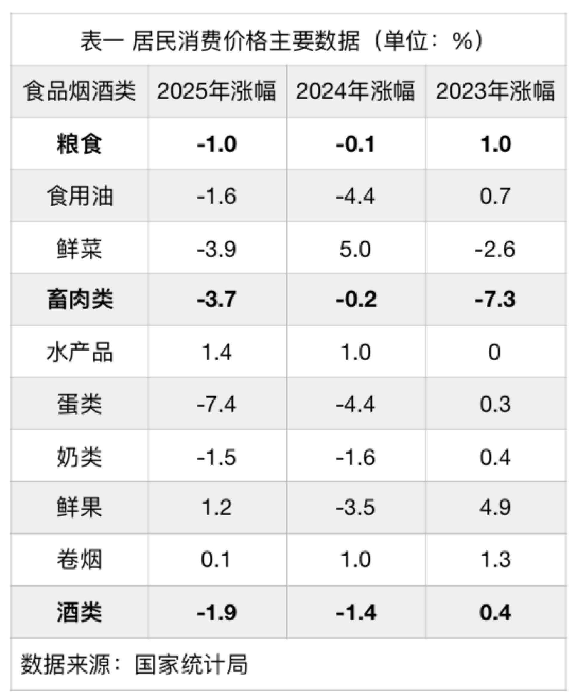 回看2025年,食品价格同比负增长成为拖累CPI增长的重要因素。如表一,在食品烟酒类,国家统计局每月会公布10个细分项的涨幅。在2025年,水产品、鲜果、卷烟的价格同比正增长,粮食、酒类、畜肉类等其余七项的价格均为同比负增长。