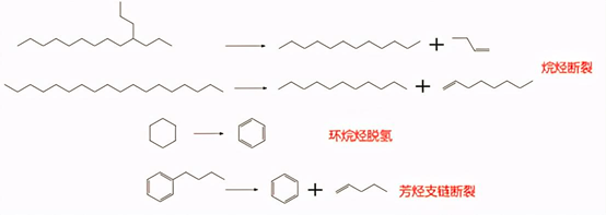 催化裂化反应大概分为上图几类,烷烃断裂,长链烷烃断裂成一个小分子烷烃和烯烃。越长的烷烃越容易断裂,断裂生成后的烷烃还会继续断裂。环烷烃脱氢生成芳香环,芳香环比较稳定,但它的支链也会断裂。