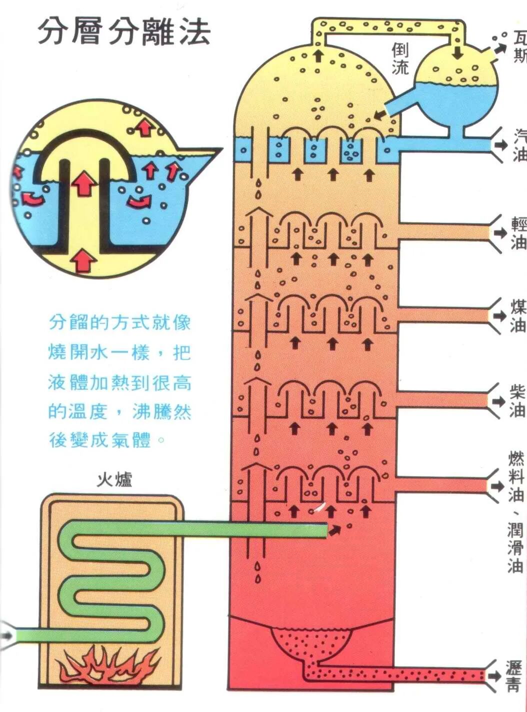 原油被加热到沸腾,蒸汽进入高耸的常减压蒸馏塔。塔内温度自下而上逐渐降低,不同重量的组分在不同的高度冷凝回收:最轻的汽油、石脑油在上部,中间的柴油、煤油在中部,重质的润滑油、沥青则在底部。