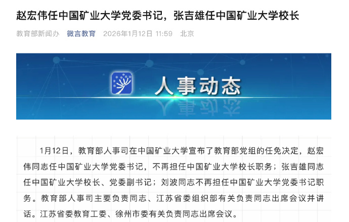 据教育部政务新媒体“微言教育”消息,1月12日,教育部人事司在中国矿业大学宣布了教育部党组的任免决定,赵宏伟同志任中国矿业大学党委书记,不再担任中国矿业大学校长职务;张吉雄同志任中国矿业大学校长、党委副书记;刘波同志不再担任中国矿业大学党委书记职务。教育部人事司主要负责同志、江苏省委组织部有关负责同志出席会议并讲话。江苏省委教育工委、徐州市委有关负责同志出席会议。
