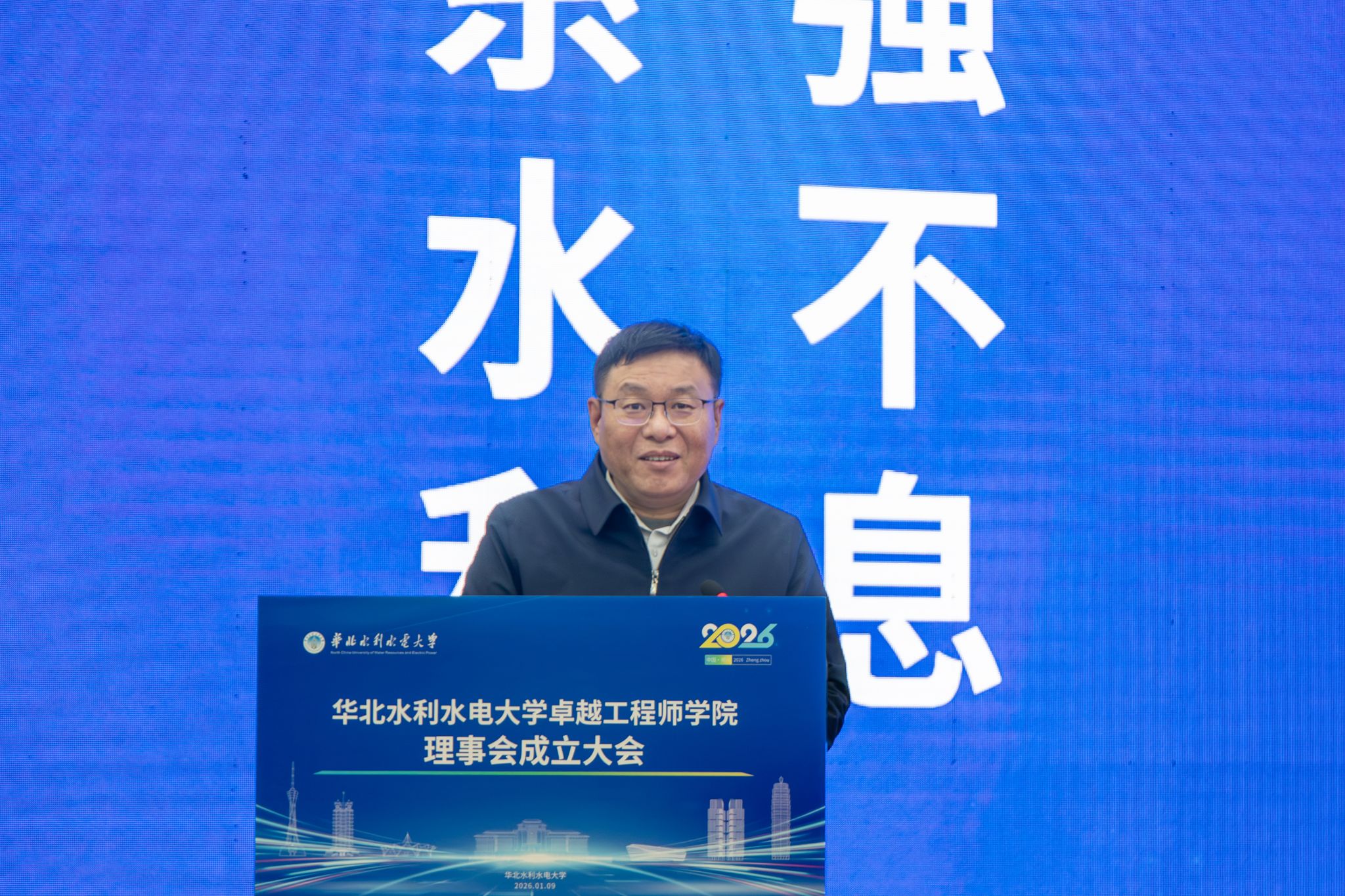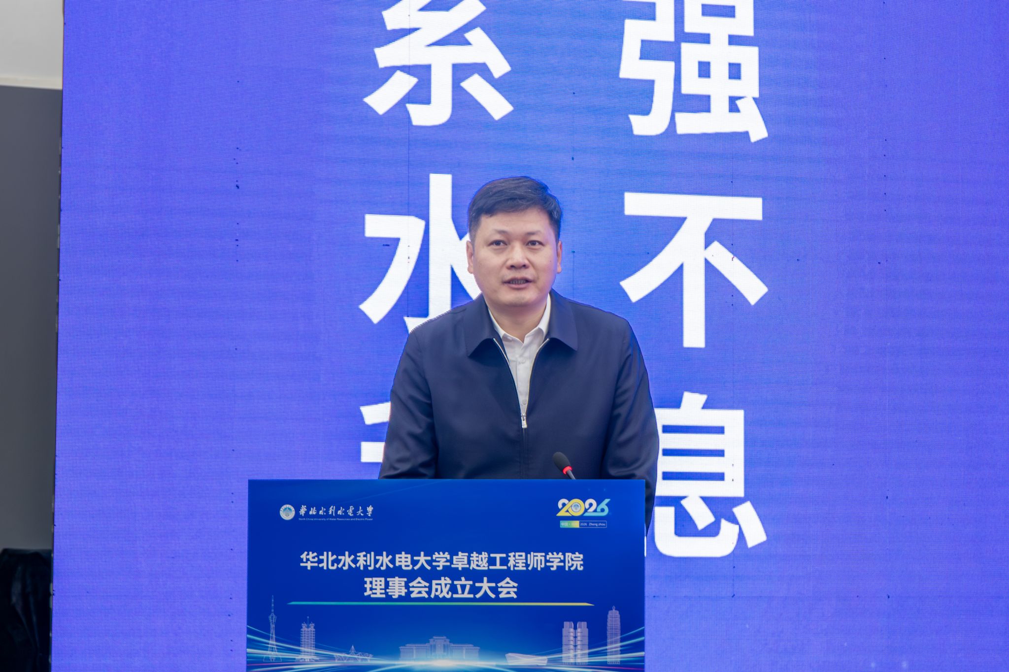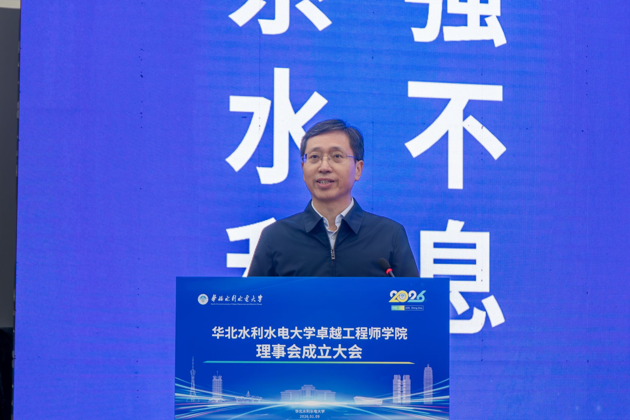 张伟代表水利部人事司对本次大会的召开表示热烈祝贺。他指出,华北水利水电大学作为水利特色鲜明、工科优势突出、办学质量优良的知名高等院校,长期以来为我国水利事业培养输送了大批卓越水利工程创新人才,作出了突出贡献。学校成立卓越工程师学院并创新性地构建理事会治理机制,是贯彻落实国家卓越工程师培养战略的务实之举,也是主动对接行业重大需求,深化产教融合,协同育人的创新实践,充分彰显了学校的时代担当与远见卓识。他强调,卓越工程师的培养,要筑牢育人根基,厚植水利情怀,引导学生在治水兴水的伟大实践中实现人生价值;要聚焦行业需求,聚力破解难题,实现专业与行业、课程标准与岗位标准、教学过程与生产过程有效对接;要锤炼综合素养,强化能力适配,引导学生既精通专业技术,又具备统筹协调、应对复杂局面的能力,适配新时代水利工程对复合型人才的多元需求;要强化平台赋能,深化协同育人,形成一批可复制可推广的卓越工程师培养“华水经验”和“水利模式”,为全国水利相关院校提供示范借鉴。