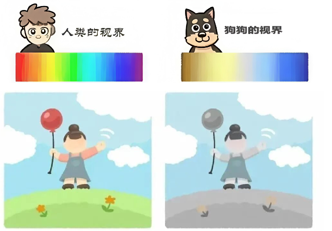 狗等大多数哺乳动物只有2种视锥细胞(对应蓝、黄波长),是“二色视者”。在狗眼里,红色的玫瑰可能是“深黄色”,绿色的草地可能是“浅灰色”,它们的视觉世界如同人类观看加了蓝黄滤镜的黑白电视。
