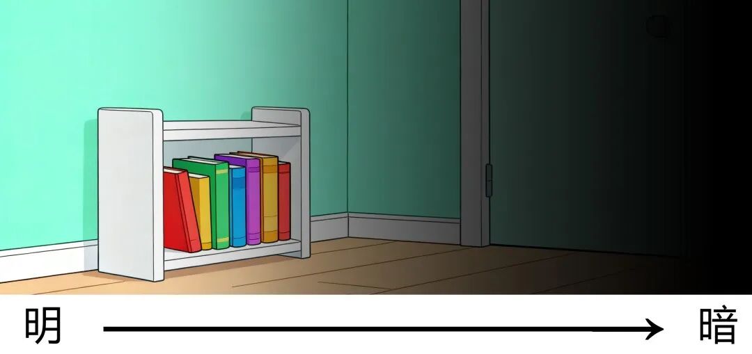 亮度逐渐降低,趋近于光线的完全缺失,视觉上感知为“黑”。