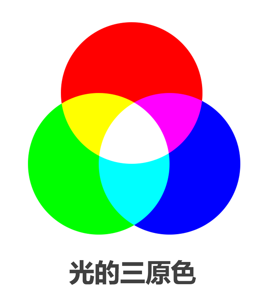 与人类眼睛有三种视锥细胞对应,光的三原色是红、绿、蓝。只需要这三种基础光就能混合出大部分颜色,比如红光+绿光混合出黄光;红光+蓝光混合出品红光;绿光+蓝光混合出青光;当红、绿、蓝以相同强度叠加时,会直接变成白光。