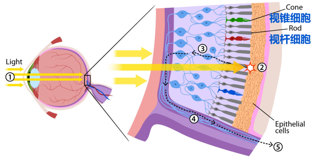 当光进入我们的眼睛,眼睛里的视网膜最终对光会产生感应。视网膜上有两组细胞,其中数量较多的一组叫视杆细胞(Rod)。视杆细胞主要负责感受较弱光线的明暗,却无法分辨颜色。