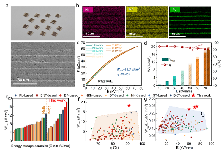 其中,近期发表的两篇论文分别报道了基于Bi0.5Na0.5TiO3和NaNbO3无铅高熵弛豫铁电体/反铁电材料,并提出“非极性纳米团簇约束工程”和“准反极性纳米团簇结构工程”优化陶瓷材料容性储能特性的新策略。在此基础上,研发制备的多层陶瓷电容器(MLCC)原型器件获得超过18.0 J·cm-3的高储能密度和92%以上的高储能效率,这些优异的综合储能性能展现出极大的应用潜力,也为未来储能电介质材料的研究提供了可行的设计范式和重要理论依据。