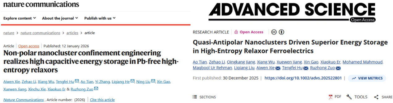 近日,淮南师范学院副院长左如忠教授领衔的先进陶瓷团队在国际顶级综合性期刊《Nature Communications》(中科院一区,IF=15.7)和《Advanced Science》(中科院一区,IF=14.1)分别发表了题为“Non-polar nanocluster confinement engineering realizes high capacitive energy storage in Pb-free high-entropy relaxors”和“Quasi-antipolar nanoclusters driven superior energy storage in high-entropy relaxor ferroelectrics”的最新研究成果。淮南师范学院作为论文通讯单位,并由中国科学院上海硅酸盐研究所、乌镇实验室、西安交通大学及安徽工程大学等单位合作完成。