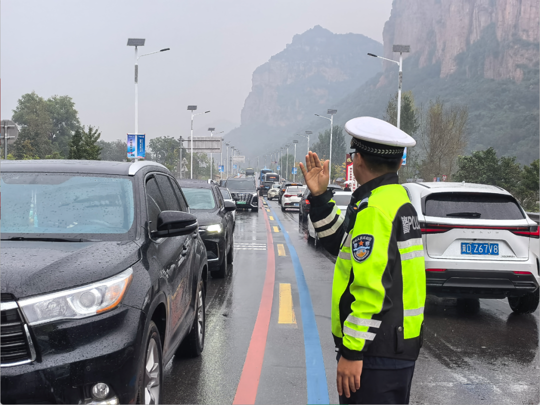 景区周边执勤警力通过多点位协同配合,全力开展车辆分流引导与现场交通疏导工作。