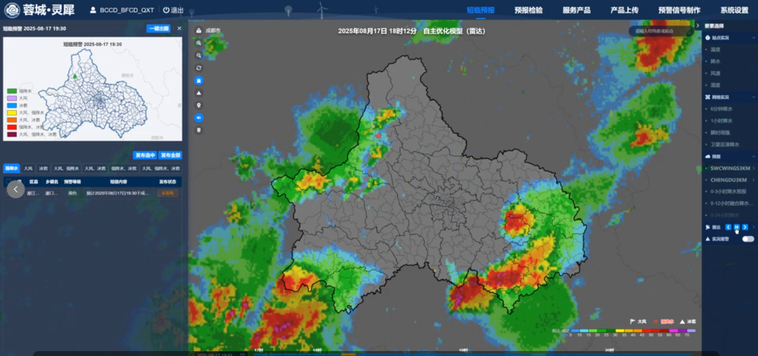 为破解高原复杂地形与城市叠加影响下的灾害天气预警难题,联合成都市气象局开展“蓉城·灵犀”短临预警系统研发,系统改进雷达回波识别与定量降水估计算法,定制县域预警参数矩阵,实现从精密监测到短临预警全流程算法精度提升,可提供0—12小时分钟级乡镇降雨估测与强降水预警服务。