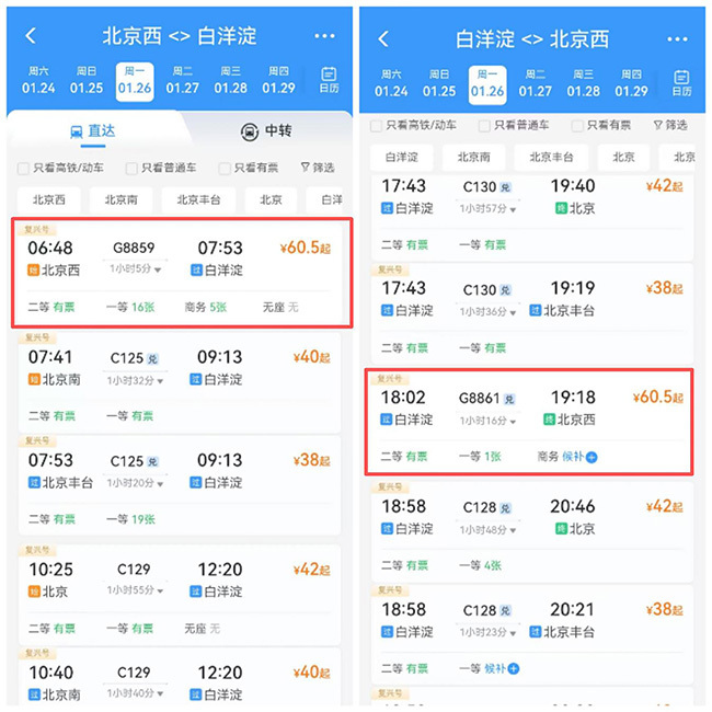此次首对北京西站直达白洋淀站的G8859/60次、G8861/62次列车,运行时刻精准匹配早晚高峰通勤规律。其中,列车早晨6:48从北京西站出发,7:53到达白洋淀站;晚间返程的列车17:59途经白洋淀站(抵达后停留3分钟,18:02出发),19:18抵达北京西站。这一安排有效满足了京雄往返群体的出行需求。
