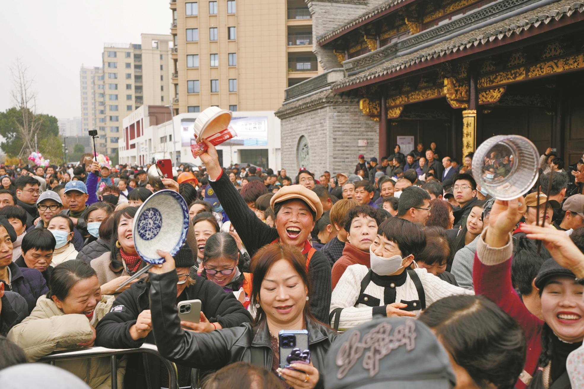 “年糕寓意年年高,就是想借着这碗热汤,祝大家新的一年鸿运当头、万事顺意。”他倡导游客自备餐具,既环保又卫生。这一贴心倡议得到了现场市民的积极响应,大家自带锅碗瓢盆前来。