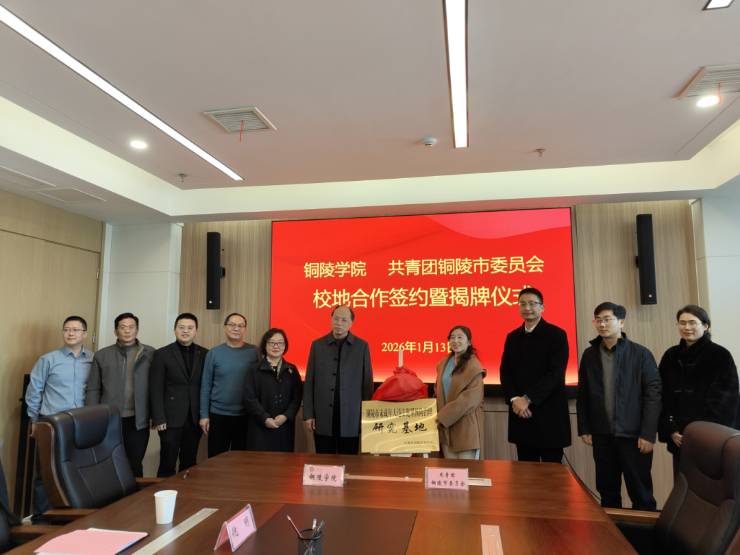 会上,双方签订《共青团铜陵市委员会与铜陵学院合作框架协议》《铜陵市青少年法治宣传教育工作情况课题研究协议》,夏美武代表学校与何婧共同为“铜陵市未成年人违法犯罪预防治理研究基地”揭牌。