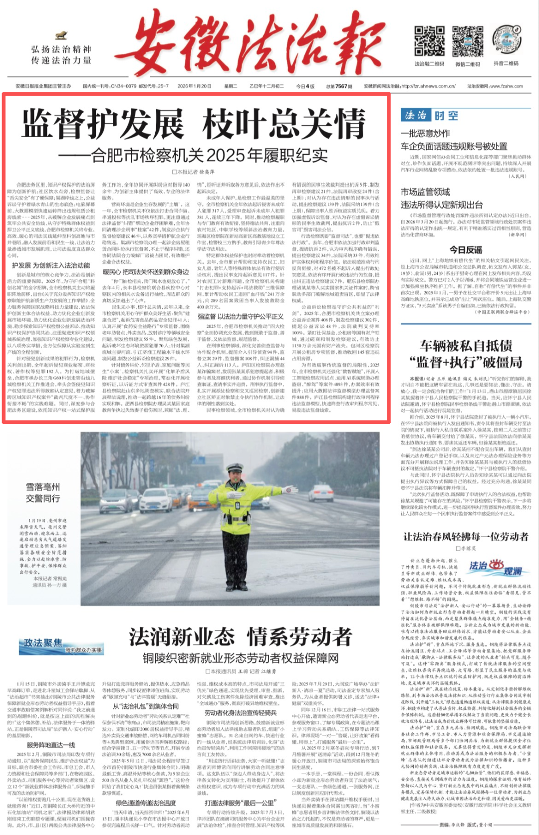 合肥法务区里,知识产权保护的法治屏障为创新护航;社区饮水点旁,检察监督让“舌尖安全”有了硬保障;巢湖岸线之上,公益诉讼守护着绿水青山的生态底色;电脑屏幕前,大数据模型快速运转筛出违规租赁公租房线索……2025年,从破解企业发展痛点到筑牢公共安全防线,从守护特殊群体权益到捍卫公平正义底线,合肥市检察机关将专业、高效、暖心的司法实践延伸至科创高地与市井巷陌,融入发展前沿和民生一线,让法治力量渗透城市发展肌理,让司法温度直达群众心间。