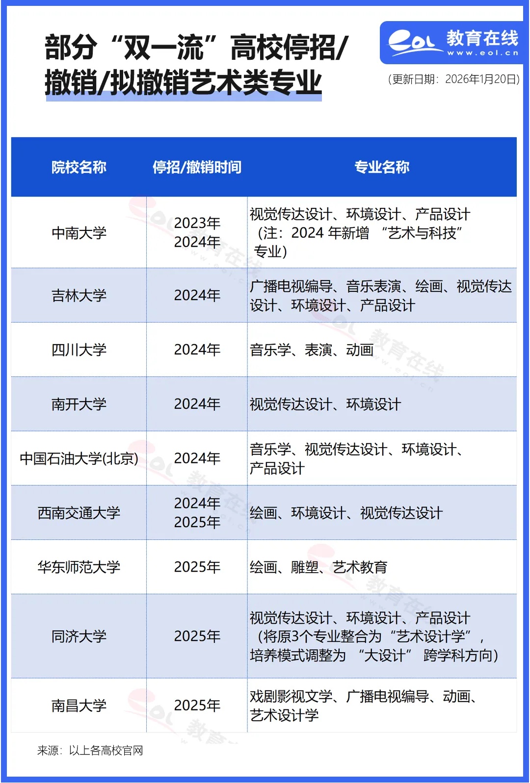 近年来,“双一流”高校更是集中缩减、停招及撤销艺术类专业。2023年起,中南大学按下艺术类招生暂停键,陆续停止环境设计、产品设计等3个设计学类专业招生;四川大学、南开大学、吉林大学紧随其后,于2024年撤销多个传统艺术类、设计类专业;2025年,华东师范大学停招绘画、雕塑、艺术教育;同济大学停招视觉传达设计、环境设计、产品设计(整合为“艺术设计学”跨学科方向)。这些曾被视为“名校光环+艺考捷径”的专业组合,正从“双一流”高校招生目录中加速消失。