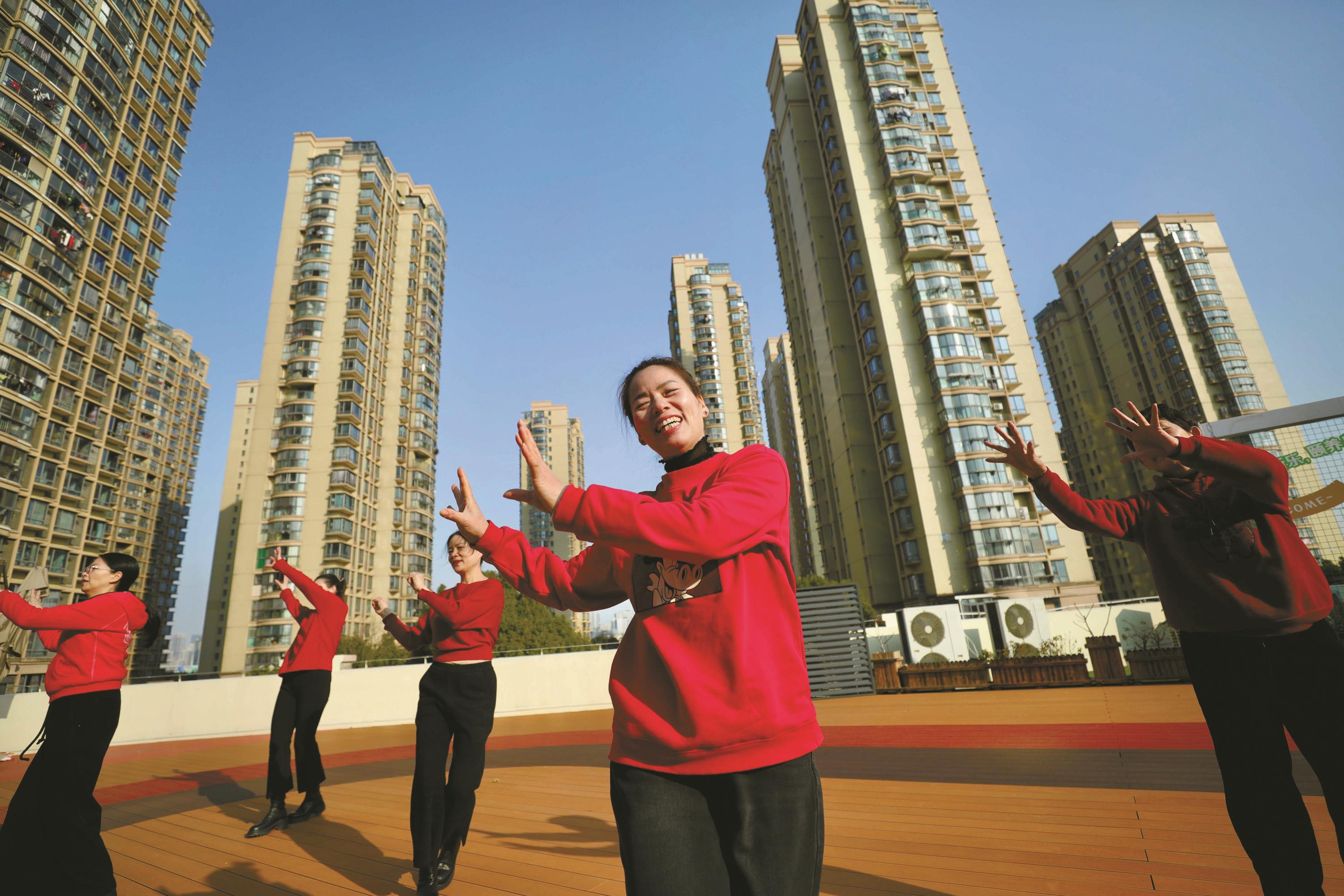 退休居民正在空中疗愈花园排练社区春晚节目《过新年》。