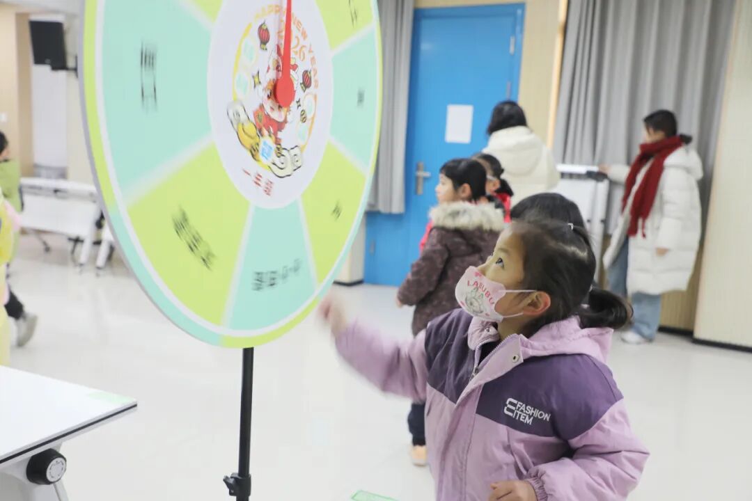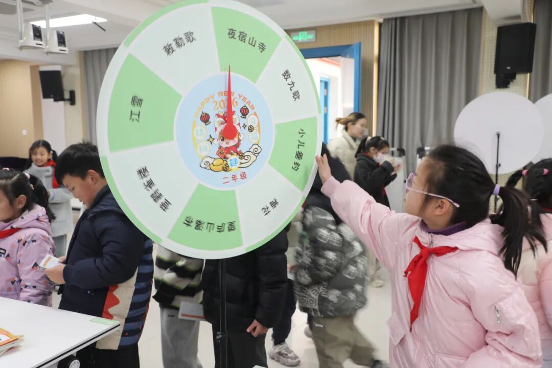 “诗词迎福马”关卡中,小小转盘一经转动,指针指向的诗词,孩子们便能立刻挺直腰背,摇头晃脑流畅背诵,有的还配上俏皮手势,自信的模样赢得在场老师和同伴的阵阵点赞。