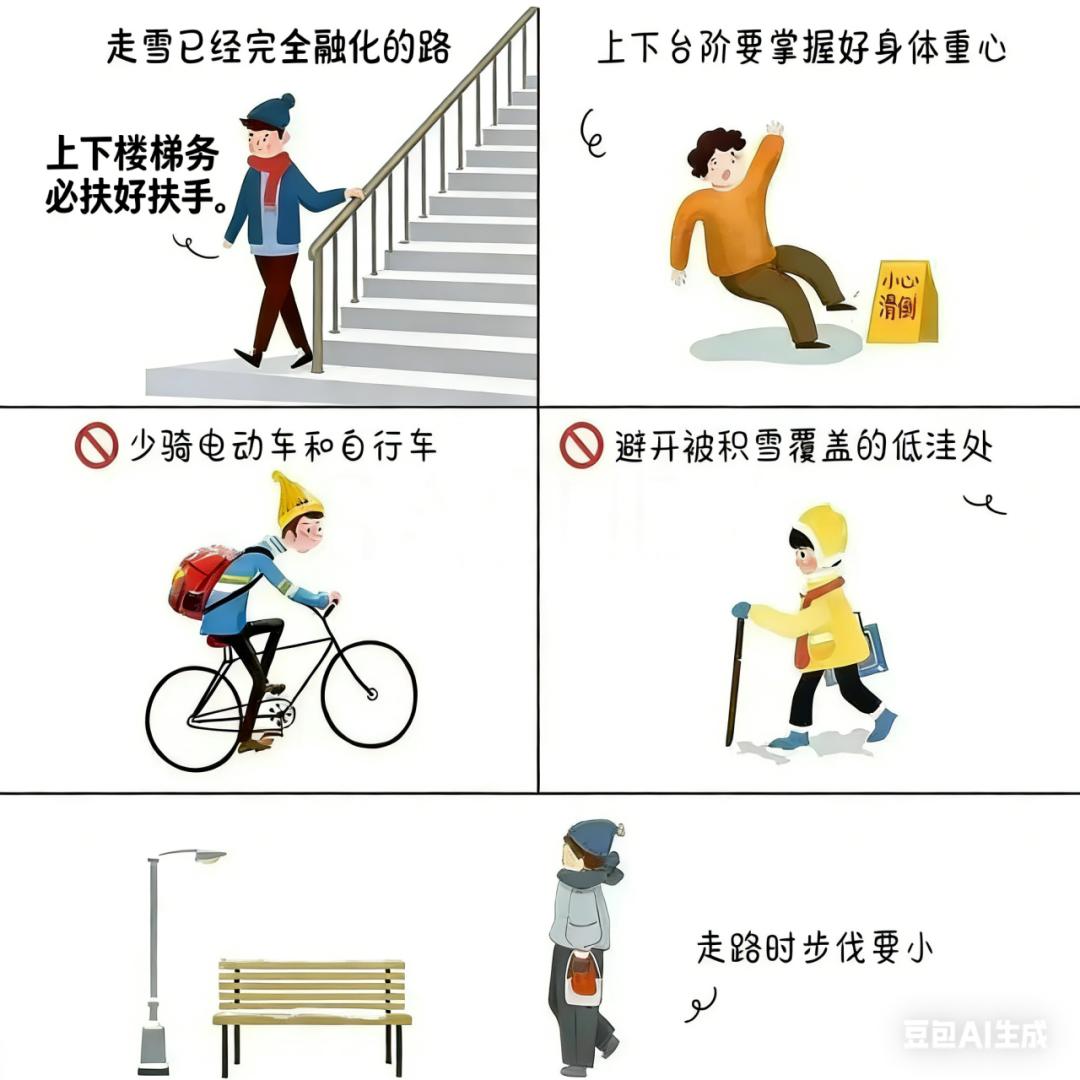 识危险:尽量选择干燥、有光照的路面,避开积水、落叶覆盖的路面。上下楼梯务必扶好扶手。