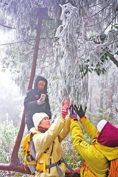 清晨的平天山云雾缭绕,树木枝条包裹在晶莹的冰挂里,将登山步道装点成银白的廊道。越往高处,雾凇景观越发壮丽,成片的灌木丛化作形态各异的冰雕群。山间的雾凇顺着风势整齐排列,犹如大自然的艺术杰作。山顶区域云雾弥漫,冰冻下静止的高山草甸在迷雾中若隐若现,增添了几分神秘意境。尽管气温已降至零下,但游客们的热情丝毫不减,或举家同行,或好友结伴,纷纷用镜头记录这难得的南国冰封画卷。来自贵州省六盘水市的几位游客,头发全变成了一绺绺冰挂,他们兴奋地表示,想不到贵港也有这么壮观的雾凇景观。