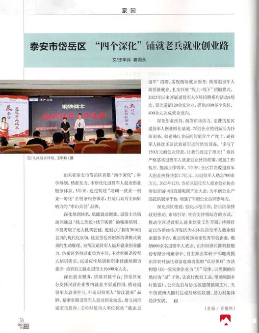 就业创业帮扶成效显著。全年审核办理创业贷款49笔,共计1850万元,完成贴息24.6万元。建立“送岗上门”制度,每周将招聘信息送到退役军人家门口。全年组织开展退役军人专项招聘活动3次,50余家企业提供600余个就业岗位,开展“送政策法规、送职业规划、送招聘信息”进军营活动。2025年在《中国双拥》刊登《岱岳区“四个深化”铺就老兵就业创业路》工作典型材料。