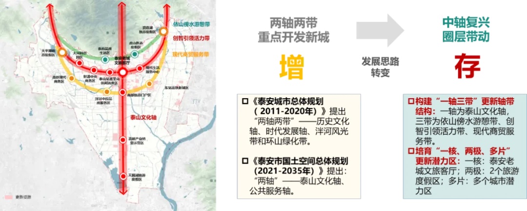二是转变城市空间结构。从增量时期的“开发新轴线、重点建新城”到 “中轴复兴、圈层带动”,确立存量空间更新主导下的“拥山发展”新格局。