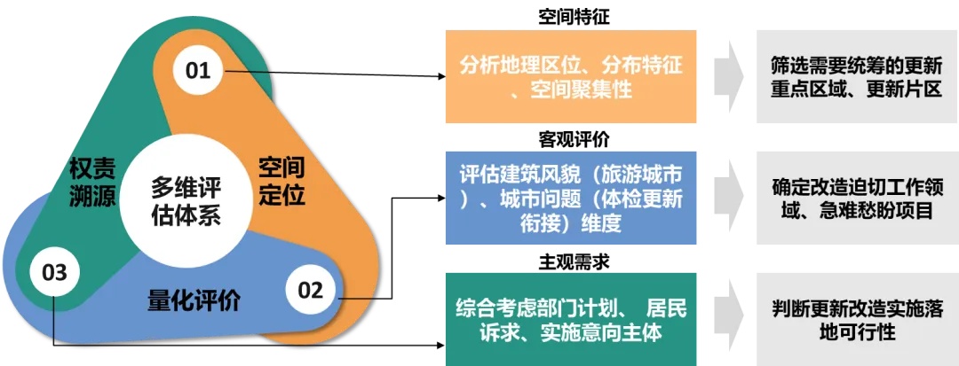 二是多维开展更新潜力评估。结合主观需求与客观评价,建立更新资源“量化评价+空间定位+权责溯源”的多维评估体系,研判更新工作急难。