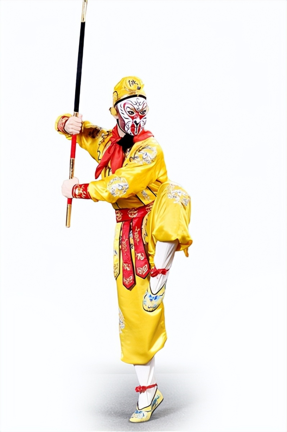云雾缭绕的白虎岭在虚拟技术中浮现,AR特效让金箍棒划破长空。而最令人屏息凝神的时刻,莫过于舞台中央:离地约10米的高空,一根特制铁棍(行话称“纣棍”)凌空悬挂。青岛市京剧院武丑演员时增帅,化身美猴王,在仅靠腰间威亚保护的情况下,于晃动的棍子上完成倒悬、转体等一系列高难度动作——“大攀纣棍”绝技,以前所未有的惊险高度和视觉冲击,直击观众心灵。
