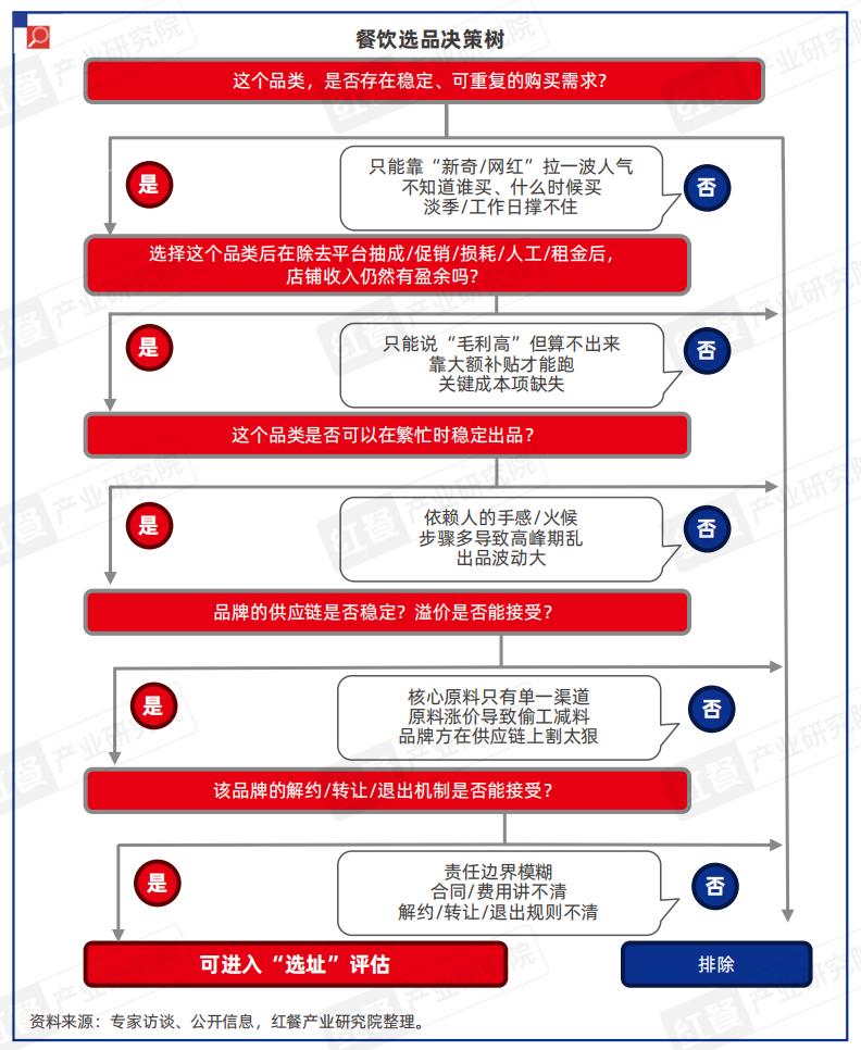 在选品策略上,餐饮加盟选品策略涵盖品类选择与品牌选择。红餐产业研究院根据品类热度、成本、标准化、供应链、品牌退出机制五个维度引入选品决策树进行校验:先针对品类,依次核查其需求热度、成本扣除后的盈利性、整体的标准化能力;再针对品牌,验证供应链稳定性及退出机制合理性。全环节校验通过方可进入“选址”评估环节。