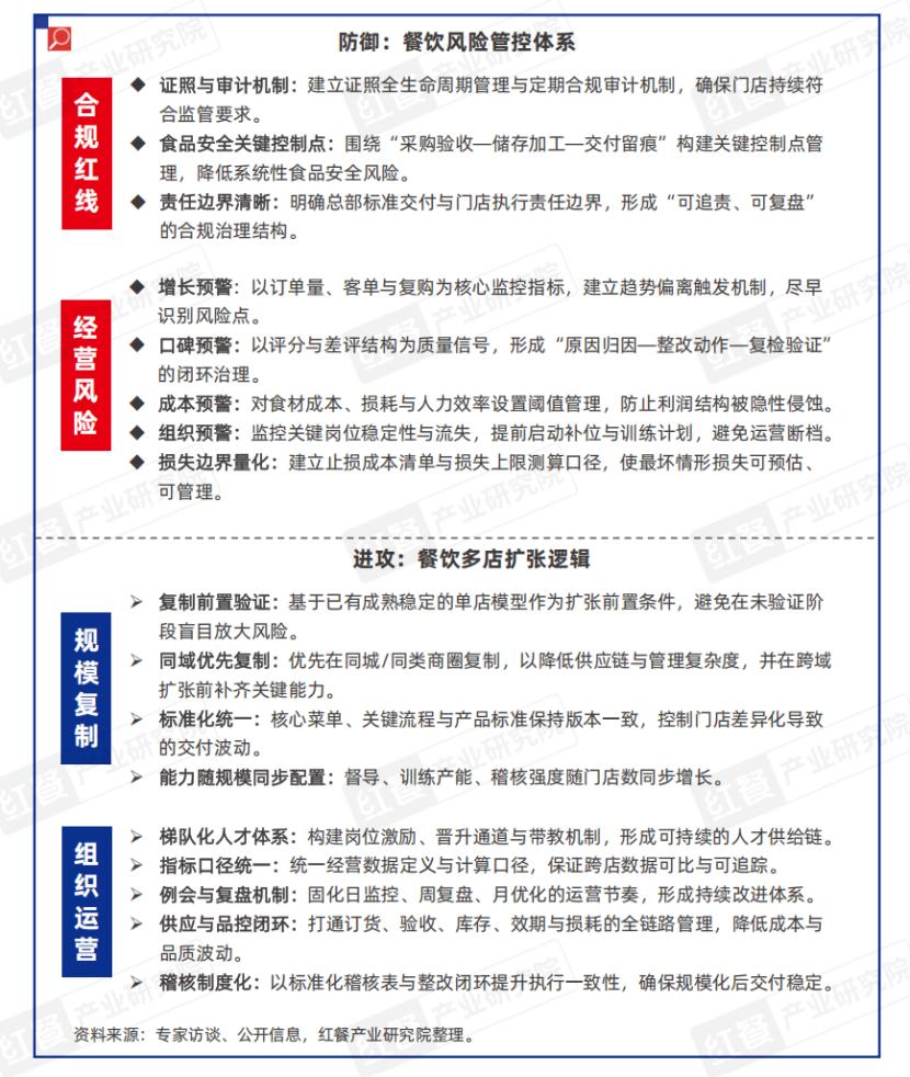 在单店模型成熟以后,很多加盟商会考虑多店拓展,但真正的挑战在于,如何将“单点优势”安全、可控地复制为“规模优势”。这需要一套攻守兼备的系统策略,为此,红餐产业研究院建立了一套防御与进攻的体系供加盟商参考。