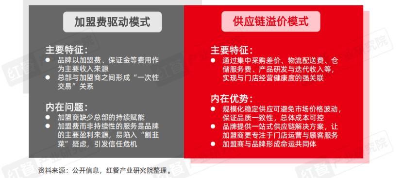 首先,品牌方盈利逻辑已从收加盟费转向供应链溢价。传统加盟费模式以一次性收费为核心,与加盟商关联弱且易存信任风险;新模式则通过集中采购、物流配送等供应链服务获利,与门店经营健康度深度绑定。