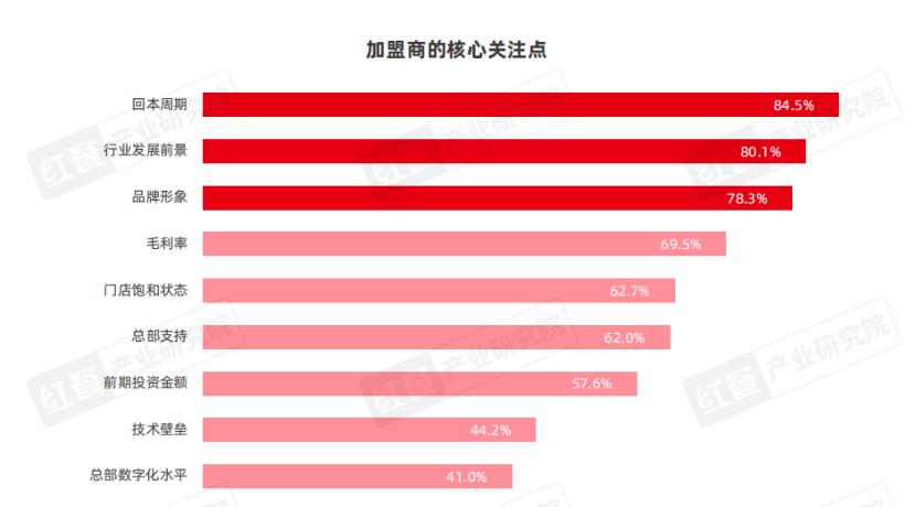 红餐产业研究院“加盟商投资意向与决策调查”结果显示,加盟商在选择项目时,最看重的三个因素分别为:回本周期、行业发展前景、品牌形象,占比分别为84.5%、80.1%、78.3%。