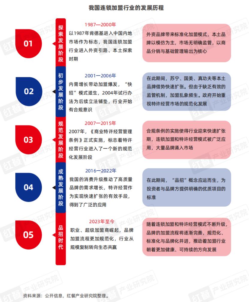 我国的连锁加盟行业历经数十年发展,历经了“探索发展—初步发展—规范发展—成熟发展—品招时代”五个阶段。当下,行业正随着政策、技术与市场需求迭代,逐步实现合规化、专业化与生态化升级。