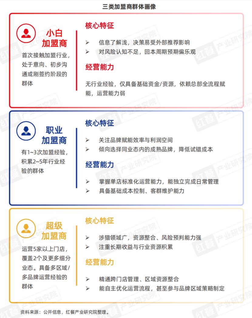 目前,连锁加盟行业的投资者主要由加盟小白、职业加盟商、超级加盟商三类群体组成,他们在经验、核心特征和经营能力上存在明显差异,其中职业加盟商和超级加盟商通过丰富的经验、专业的能力和雄厚的资金实力等能力优势,正在逐渐成为加盟市场主流群体。