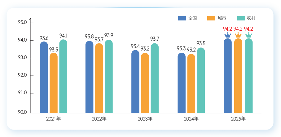 从城乡维度来看,2025年城市公众气象服务满意度为92.4分,农村为91.9分,城市满意度已连续6年超过农村。值得关注的是,2025年度城市与农村地区的气象灾害预警服务满意度实现持平,均达94.2分,其中城市较上年提升1.0分,农村地区也保持稳定增长态势。