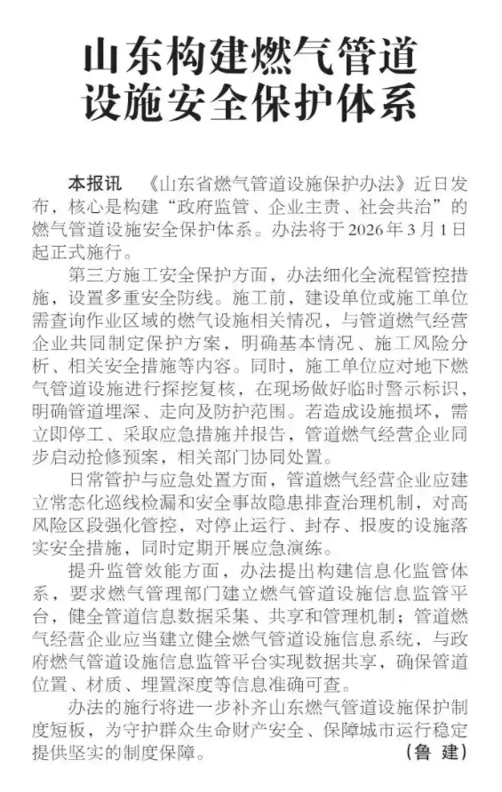 《山东省燃气管道设施保护办法》近日发布,核心是构建“政府监管、企业主责、社会共治”的燃气管道设施安全保护体系。办法将于2026年3月1日起正式施行。
