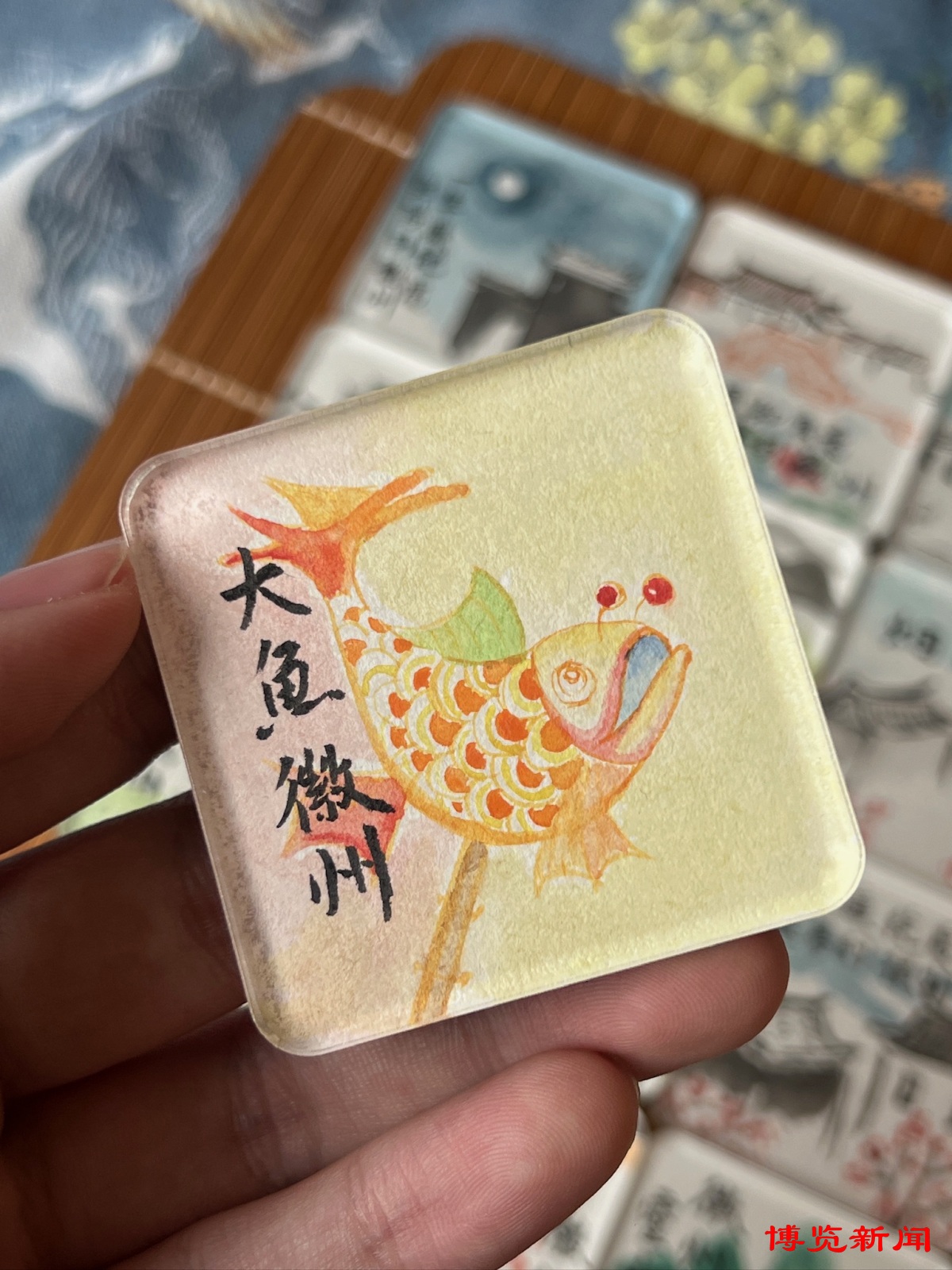 他们的原创作品“淄博元素”冰箱贴,将周村古商城、海岱楼等本地地标融入设计,方寸之间尽显齐风古韵;九宫格“招财猫”“福狗”“神马”等创意摆台,构思精巧、笔法细腻,憨态可掬的卡通形象让游客爱不释手。