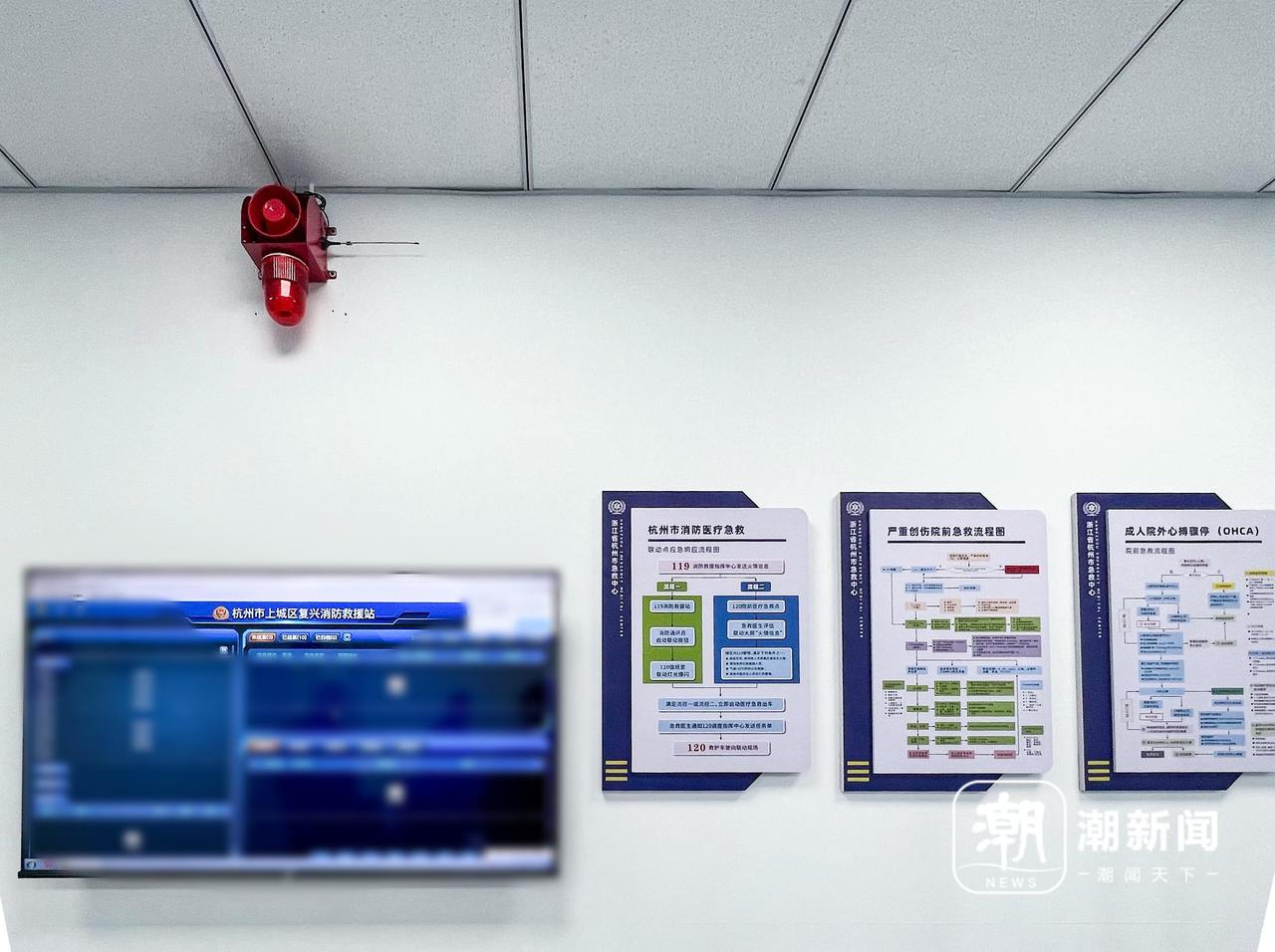 复兴消防医疗急救联动点内设置的声光报警装置和接警信息屏。谢春晖/摄