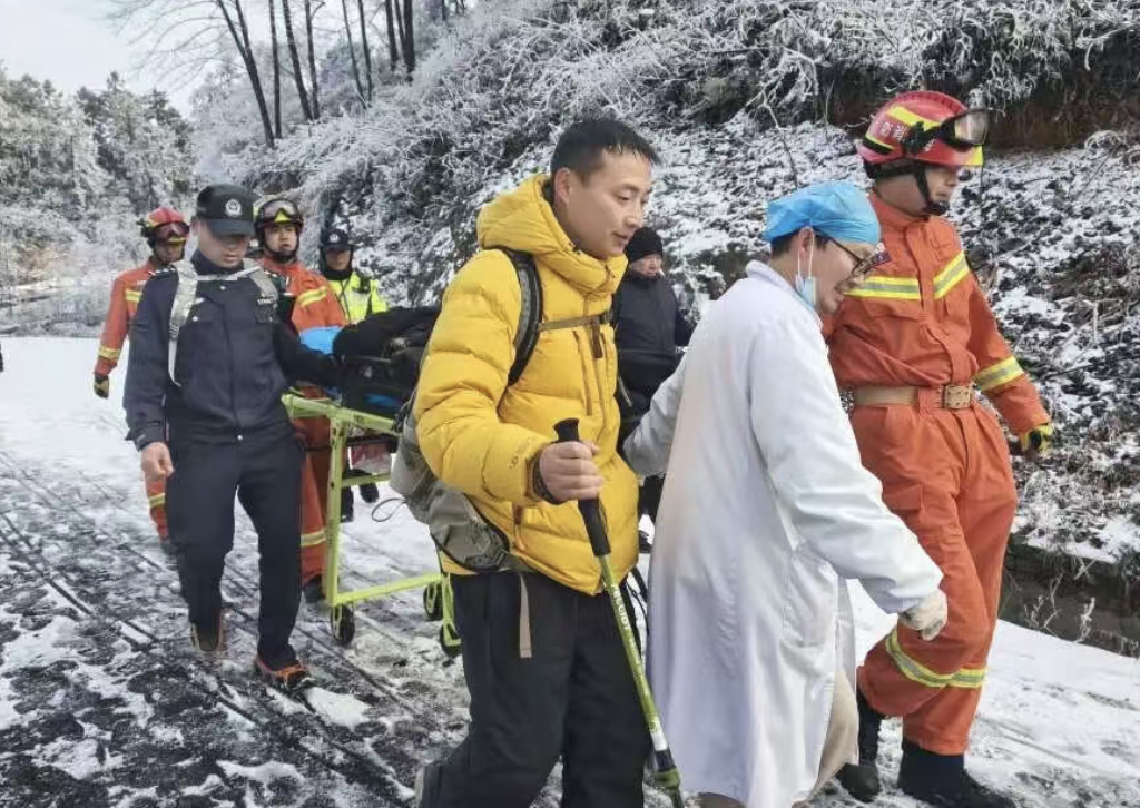 一周多前,杭州建德山区降雪,一名50多岁的女性上山赏雪时不慎摔倒受伤,被困山中。随行人员报警后,公安、消防、120急救中心和林业等部门迅速联动展开救援。公安利用无人机在茫茫雪野中搜寻被困者;消防员、民警、急救医生与义警志愿者组成联合救援小组,携带担架、绳索、保暖物资等装备进山。无人机锁定被困人员位置后,救援人员徒步抵达现场,历时4个多小时,成功将伤者用担架抬下山。