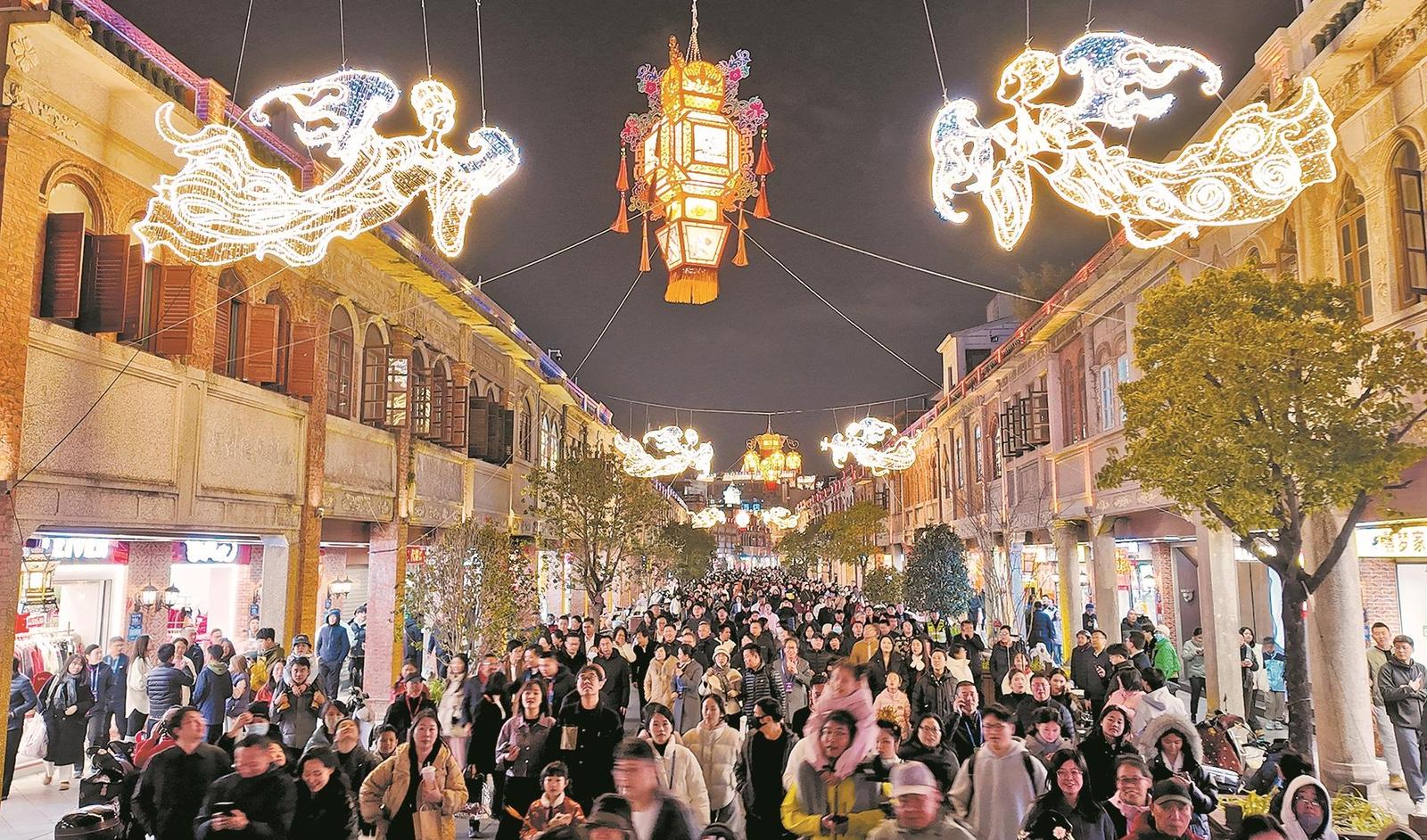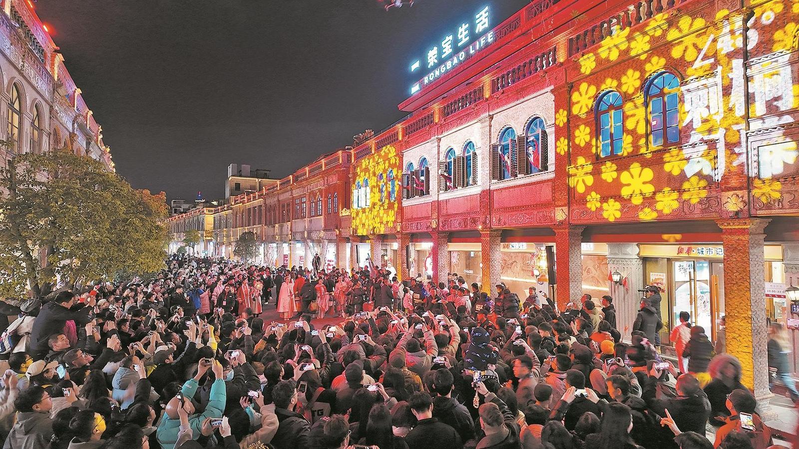 亮灯仪式后,中山中路上演了沉浸式演出《刺桐宋潮·海丝迎春》,以“幻幕”光影技术打造古今对话的视觉盛宴。这场“刺桐幻幕”演出,以宋元刺桐港“世界海洋商贸中心”的繁荣盛景为基底,将南音、拍胸舞、火鼎公婆、掌中木偶、提线木偶等闽南非遗项目融入剧情,在《爱拼才会赢》等经典闽南语歌曲的伴奏下,再现“市井十洲人”的多元共生场景。整场演出聚焦闽南传统迎春习俗,通过科技赋能让非遗“活”起来,当演员们用亲切的闽南语高呼“来泉州过年咯!”时,现场气氛达到高潮。