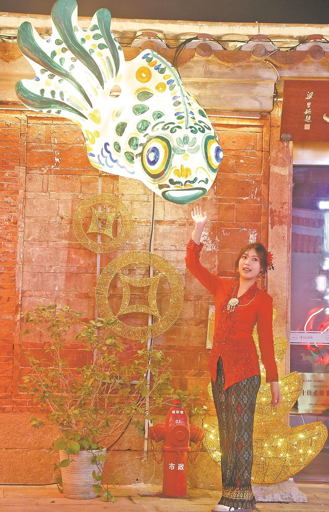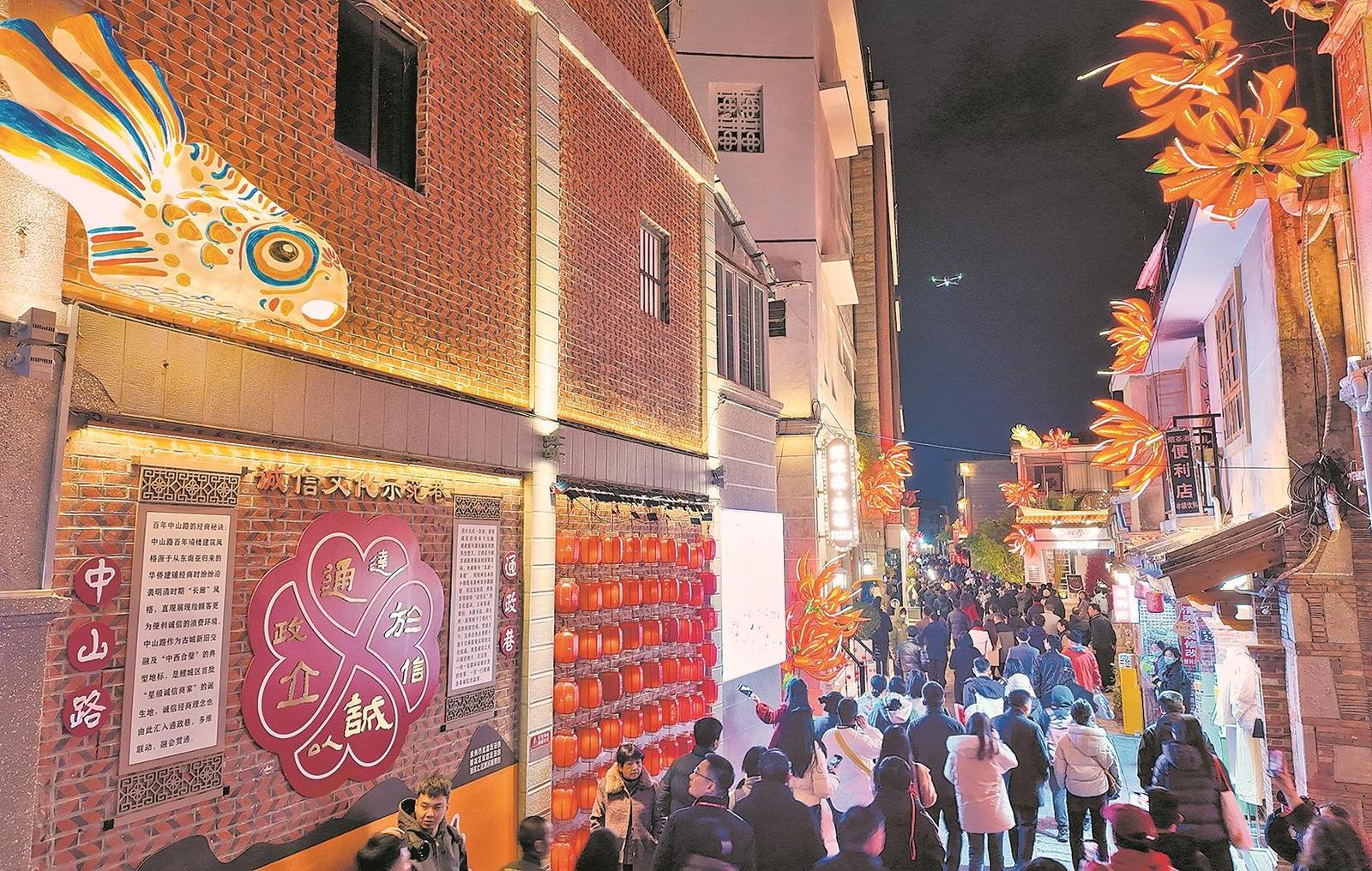与此同时,泉州通政巷的刺桐花灯同步正式亮灯,为古城增添一抹火红亮色。作为泉州市的市花,刺桐花红似火,象征着闽南人对未来的美好希冀,如今这些象征希望的“花朵”沿着通政巷的巷口、屋顶、檐角次第“绽放”,一路繁花簇拥,将古巷装扮得格外喜庆。值得一提的是,今年通政巷的花灯特别融入闽南传统建筑构件“滴水兽”元素,憨态可掬的造型搭配“刺桐滴水兽,好运攒个够”的吉祥寓意,成为古巷中的人气打卡点。