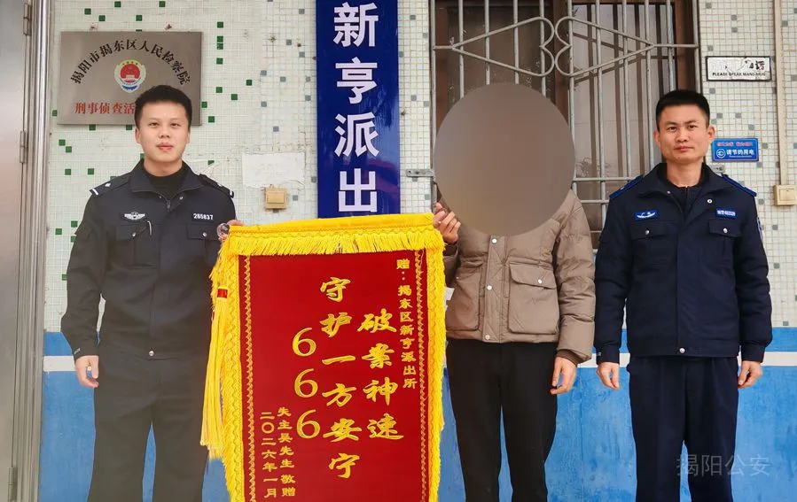 1月23日上午,揭东分局新亨派出所收到一面印着“破案神速 守护一方安宁 666”的锦旗。赠送人吴先生感谢警方及时为其追回被盗财物。
