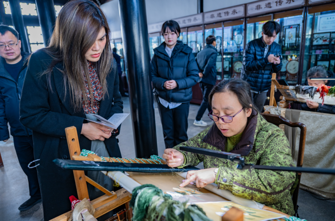 从车水马龙的学前街步入,故居内仍然如百年前般清静典雅。在故居内的锡绣工作室,一幅栩栩如生的山茶花绣面吸引了嘉宾目光。“一根丝线要劈到几十分之一,一幅作品需耗时大半年。”随着老师讲解无锡非遗精微绣的技艺,香港西九文化区管理局外事主任郭嘉莹连连赞叹。这是她首次来锡,作为外事工作后辈,走进晚清著名外交家薛福成的故居让她倍感亲切,而园林景致与非遗匠心更让她对锡港文化合作有了新思考:“今天看到的非遗元素很适合联动推广,相信未来在文化传承领域,锡港会碰撞出合作火花。”