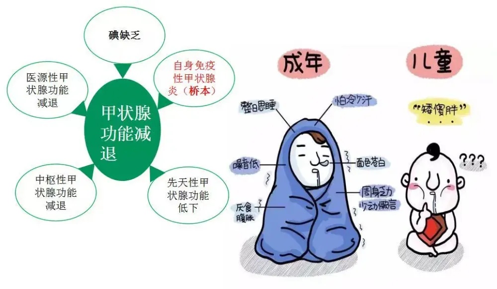 典型甲减 | ↑ | ↓ | ↓或正常 | 自身免疫性甲状腺炎(包括桥本甲状腺炎、萎缩性甲状腺炎、产后甲状腺炎等),其他还有131I治疗后甲减、甲状腺切除术后甲减、亚急性甲状腺炎的甲减期。 | 内分泌科就诊,考虑甲状腺素替代治疗 |