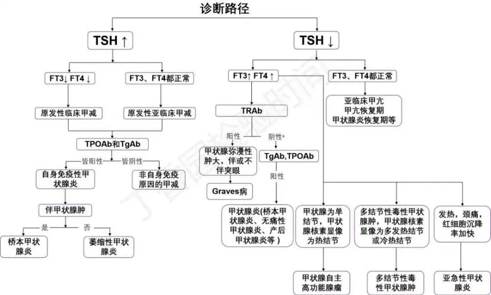 甲状腺毒症 | ↓ | ↑ | ↑ | 分为甲亢和非甲亢两类,甲亢最常见的病因是弥漫性毒性甲状腺肿;非甲亢主要包括亚急性甲状腺炎、桥本甲状腺炎、医源性甲状腺毒症等 | 内分泌科就诊,完善TRAb等检查 |