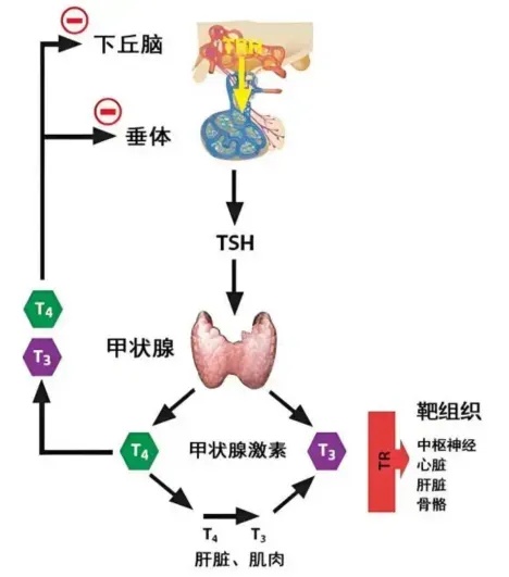 甲状腺是人体最大的内分泌腺,产生的甲状腺激素包括甲状腺素(thyroxine,T4)和三碘甲状腺原氨酸(triiodothyronine,T3),能调节机体的生长发育、新陈代谢和组织脏器功能。这个过程受垂体分泌的促甲状腺激素(TSH)精密调控,形成“下丘脑-垂体-甲状腺轴”这一精密反馈系统。