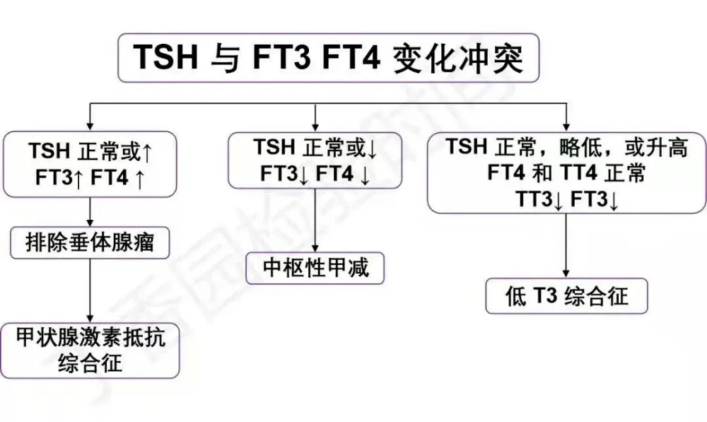 罕见甲状腺疾病 | ↑ | ↑ | ↑ | 罕见甲状腺疾病,如分泌TSH的垂体腺瘤、β型甲状腺激素抵抗综合征等 | 内分泌科就诊明确诊断 |