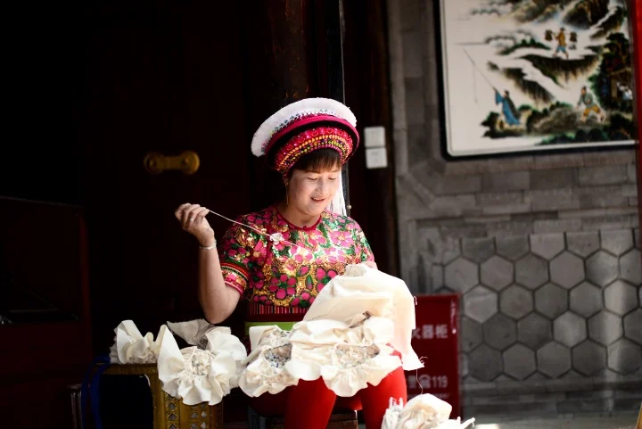 距离大理古城约20公里的喜洲镇周城村,汩汩的泉水顺着七拐八弯的巷道流淌,两侧白墙青瓦院落是白族的传统建筑。一阵风吹来,院子里晾晒的扎染布如蝴蝶翻飞,扎染的主要染料——板蓝根发酵出的独特清香萦绕不去。白族扎染技艺的国家级代表性传承人段银开指间缠绕着针线,素白棉布在针脚间蜷成细密的结。