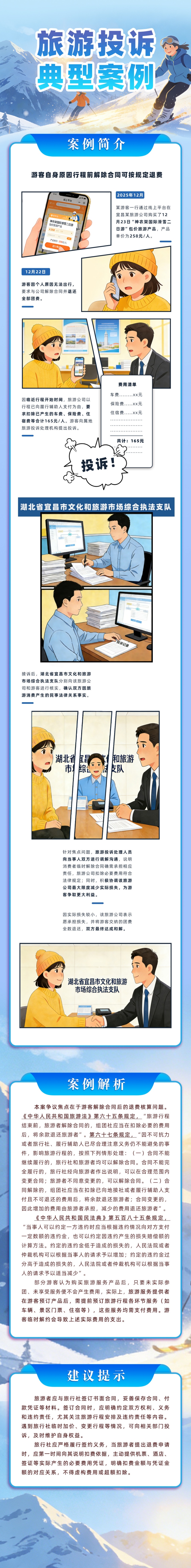 2025年12月,某游客一行通过线上平台在湖北宜昌某旅游公司购买了12月23日“神农架国际滑雪二日游”包价旅游产品,产品单价为258元/人。12月22日,游客因个人原因无法出行,要求与公司解除合同并退还全部团费。因临近行程开始时间,旅游公司以行程已向履行辅助人支付为由,要求扣除已产生的车费、保险费、住宿费等合计165元/人。游客向属地旅游投诉处理机构提出投诉。接诉后,宜昌市文化和旅游市场综合执法支队分别向该旅游公司和游客进行核实,确认双方因旅游消费产生的民事法律关系事实。针对焦点问题,旅游投诉处理人员向当事人双方进行调解沟通,说明消费者临时解除合同确需承担相应责任,旅游公司扣除必要费用符合法律规定;同时,积极协调该旅游公司最大限度减少实际损失,为游客争取更大利益。因实际损失较小,该旅游公司表示愿承担损失,并将游客交纳的团费全数退还,双方最终达成和解。