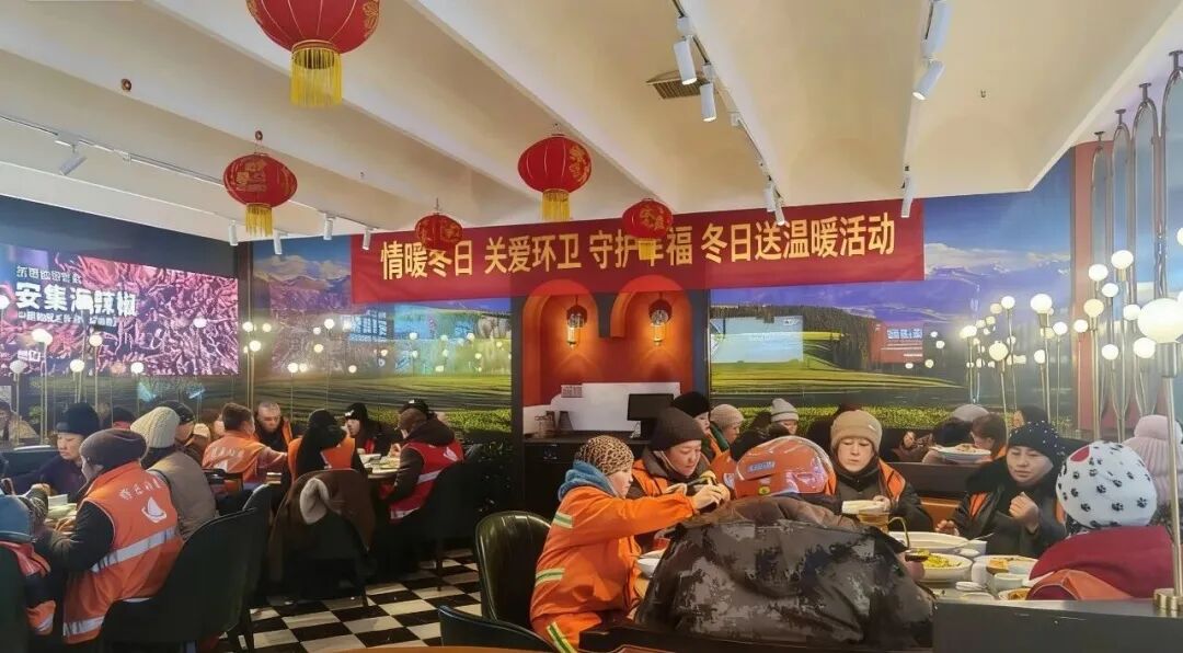 中午时分,结束了一上午忙碌工作的环卫工人、执勤民警和外卖骑手们陆续走进餐厅。大家围坐在一起,品尝着可口的饭菜,交流着日常的点滴。一碗热汤,驱散了冬日的寒意;一餐美食,慰藉了忙碌的辛劳。现场充满欢声笑语,一片暖意融融。