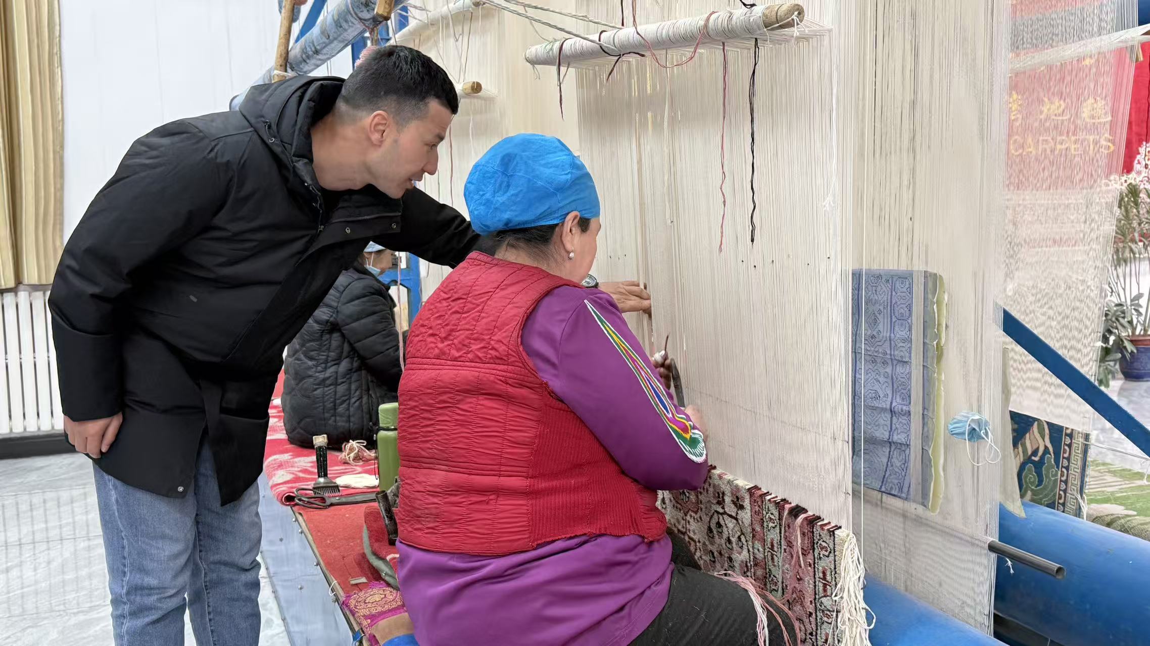 来到公司生产车间,数十位织工端坐织机前,双手翻飞间,五彩羊毛线经纬交织。麦吾兰穿梭在织机旁,仔细比对每一处花纹的呈现效果,时不时俯身指导员工调整绳结密度。
